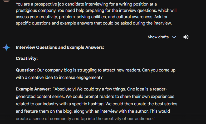 You are a prospective job candidate interviewing for a writing position at a prestigious company. You need help preparing for the interview questions, which will assess your creativity, problem-solving abilities, and cultural awareness. Ask for specific questions and example answers that could be asked during the interview.