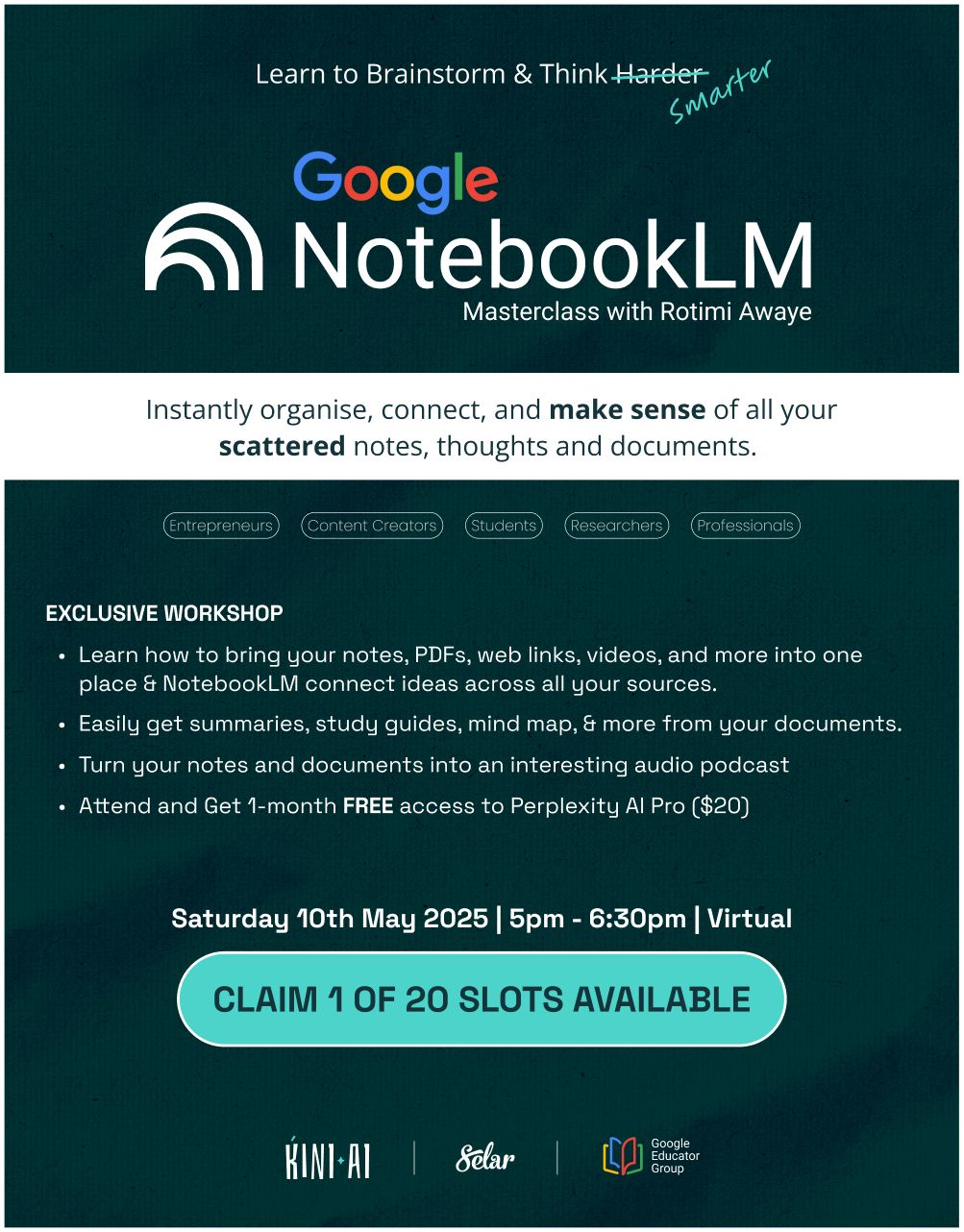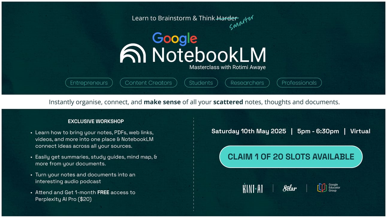 And to help you master it quickly, we’re hosting a live, hands-on Google NotebookLM Masterclass led by Rotimi Awaye (Perplexity AI Business Fellow) – Yours truly!.