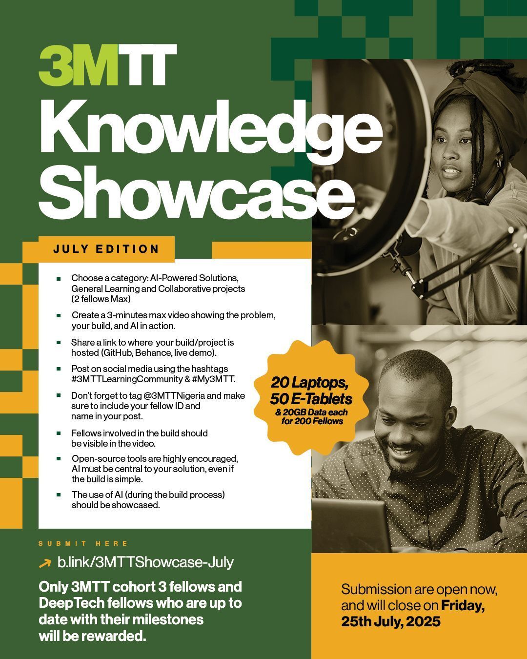 Lagos, Nigeria – The much-anticipated July Knowledge Showcase for the 3 Million Technical Talent (3MTT) program is officially LIVE! This is a critical opportunity for fellows, especially as Cohort 3 nears its conclusion. Participants are strongly urged to act swiftly, as this could be their final chance to win a laptop. Submissions close on Friday, July 25th, 2025.
