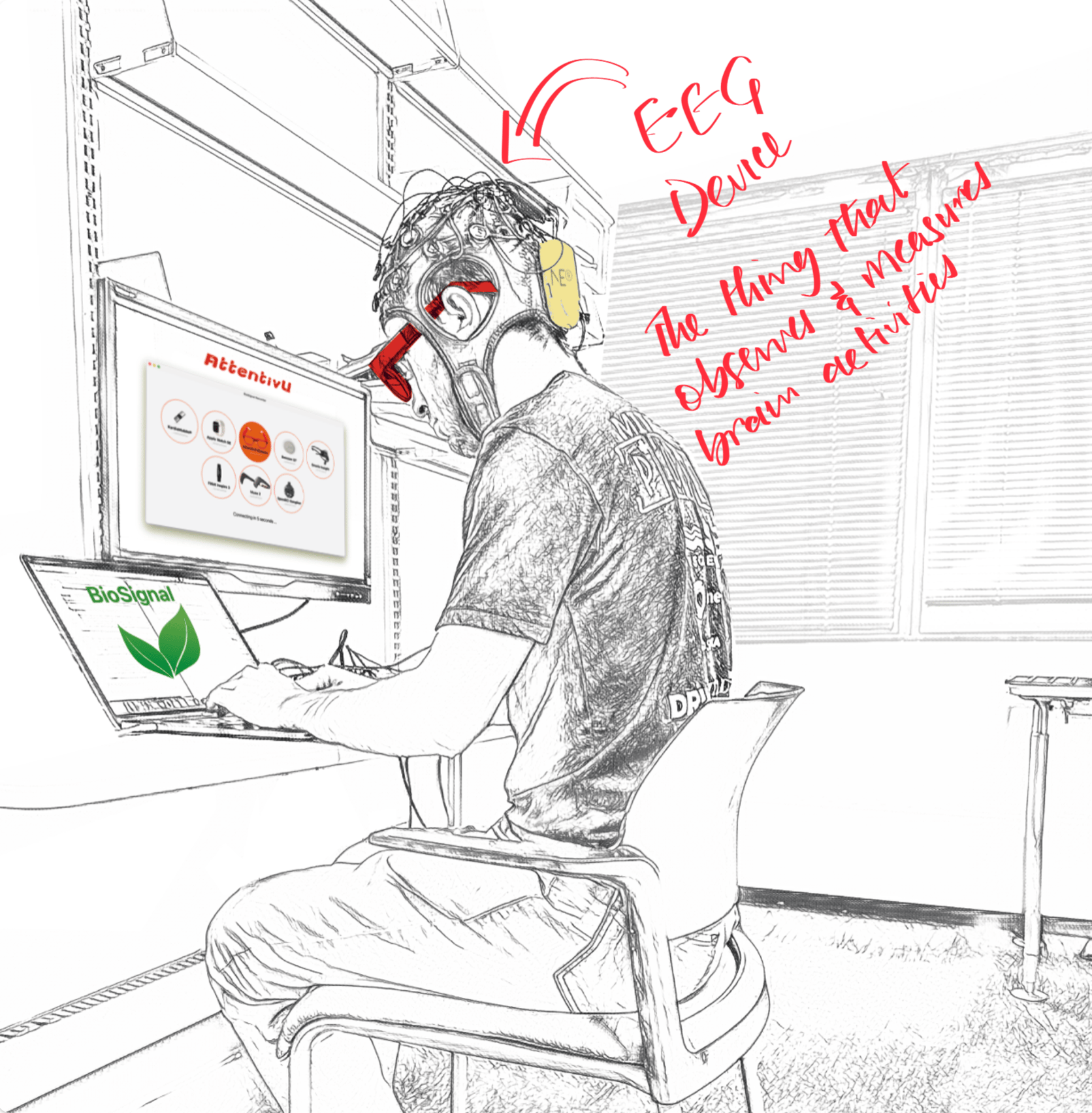 Participant during the session, while wearing Enobio headset, AttentivU headset, using BioSignal recorder software