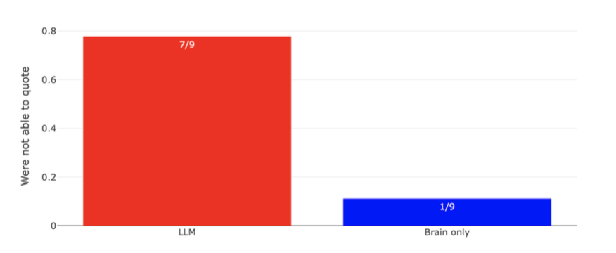 The folks who relied on ChatGPT initially struggled big time when they had to go solo. A whopping 7 out of 9 (78%) couldn’t even quote from their own essays, and only 1 out of 9 could get a quote right. It was like their brain hit Olumo rock, Omo!
