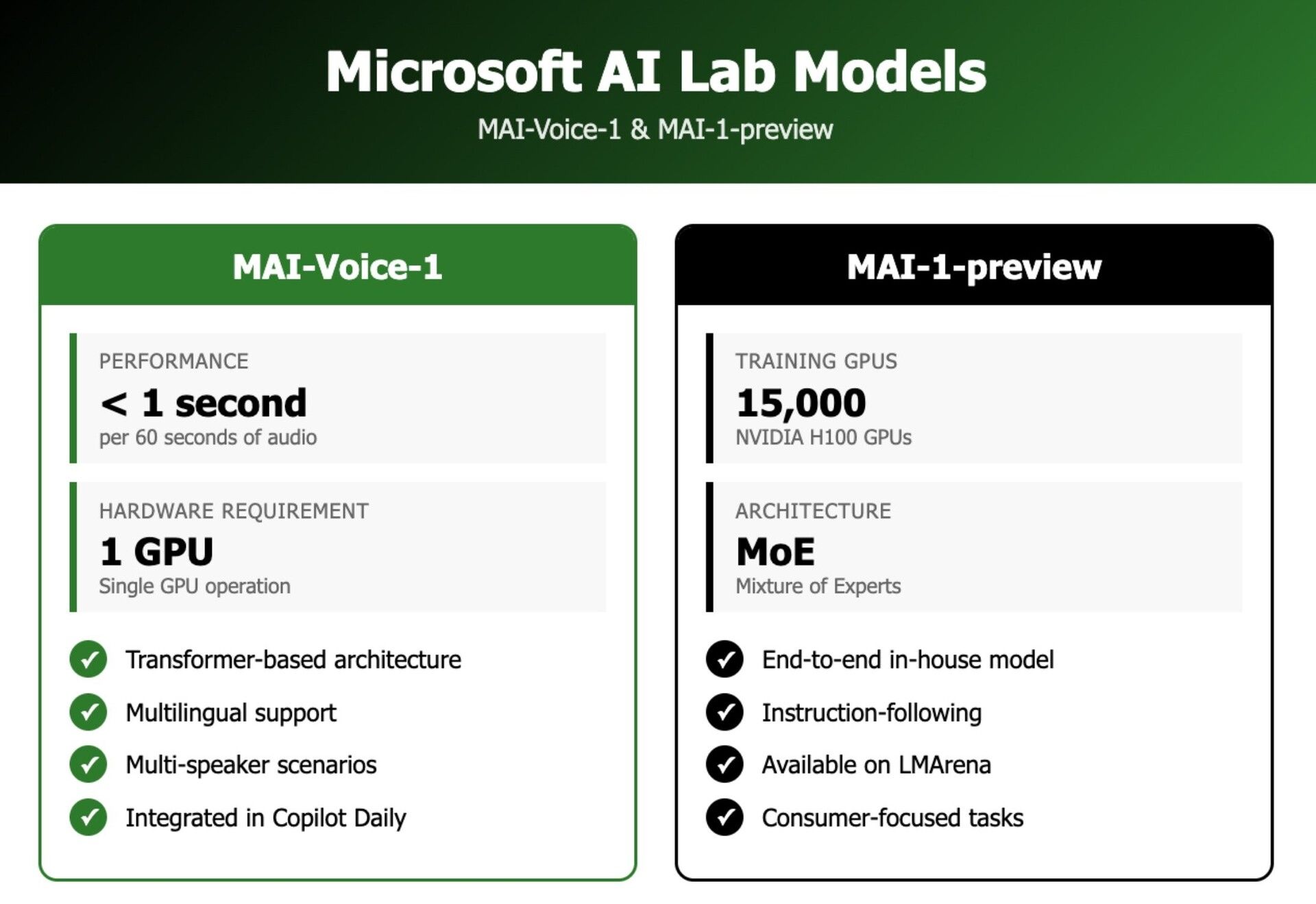 MAI-1-preview → Microsoft’s first end-to-end foundation model built entirely in-house. It was trained on 15,000 Nvidia H100 GPUs (a fraction of what competitors like Elon Musk’s xAI used). It’s designed for everyday consumer use, not just enterprise customers.