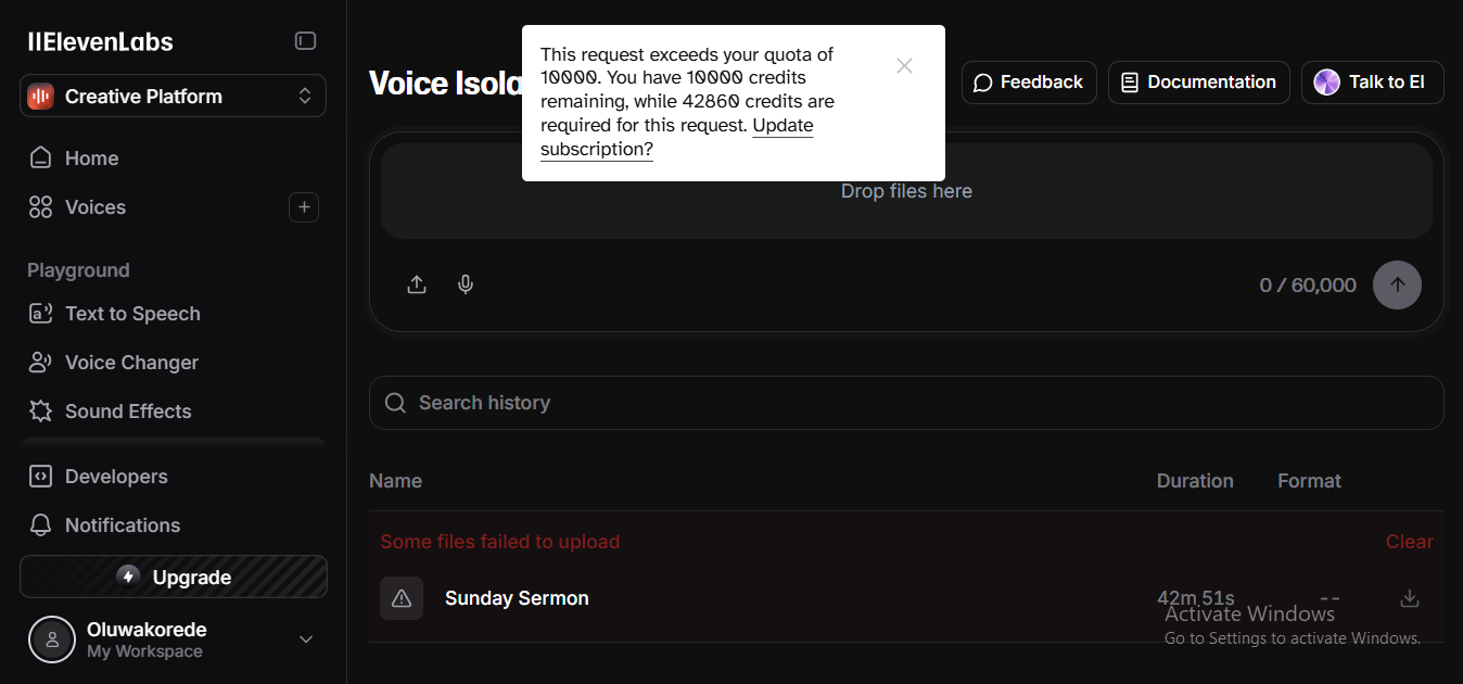 Caveat: It consumes a lot of credits, so the tier of your subscription determines how much you can do with the voice isolator (as shown in the image below)