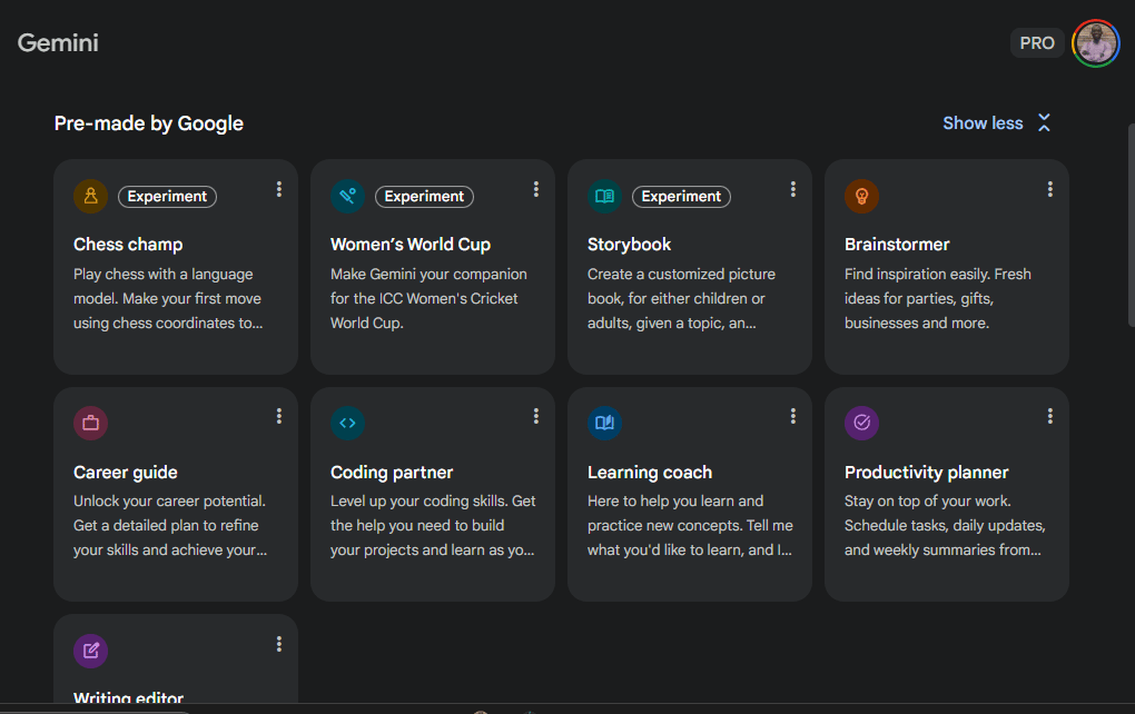 First, you have a choice: you can start by picking a ready-to-use expert from Google’s gallery of Premade Gems (like a Career Guide or a Trip Planner) and customize it, or you can build a Gem from scratch.
