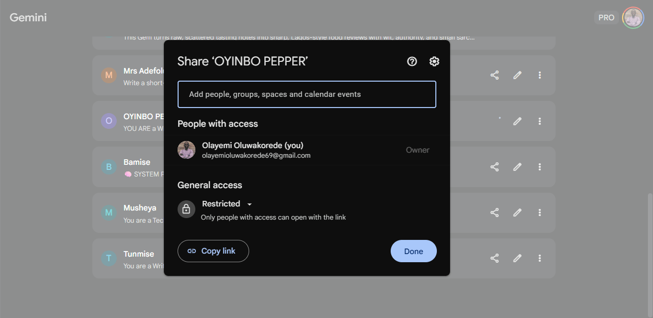Oluwakorede X Google Gems (Source: Screenshot by Oluwakorede)