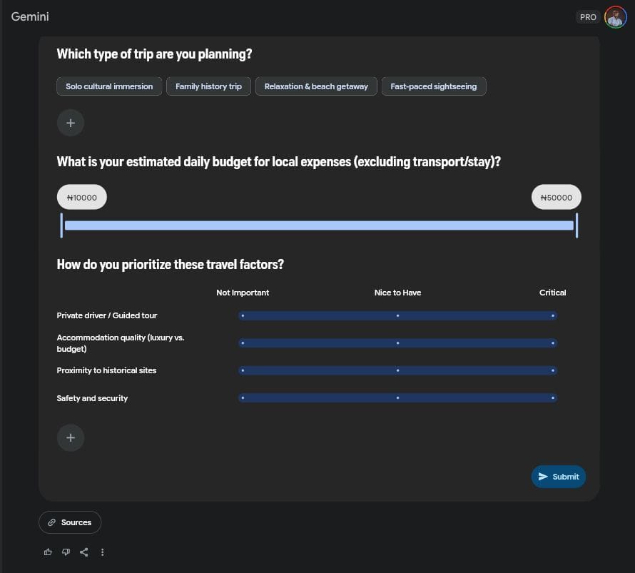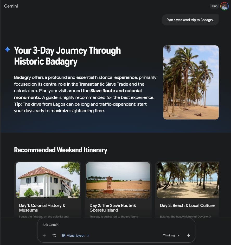 If you ask, “Plan a weekend trip to Badagry,” it won’t just write a list. It will generate a beautiful, interactive layout with pictures of the slave museum, a map of the route, and clickable buttons for hotels. It creates a mini-website just for your answer.